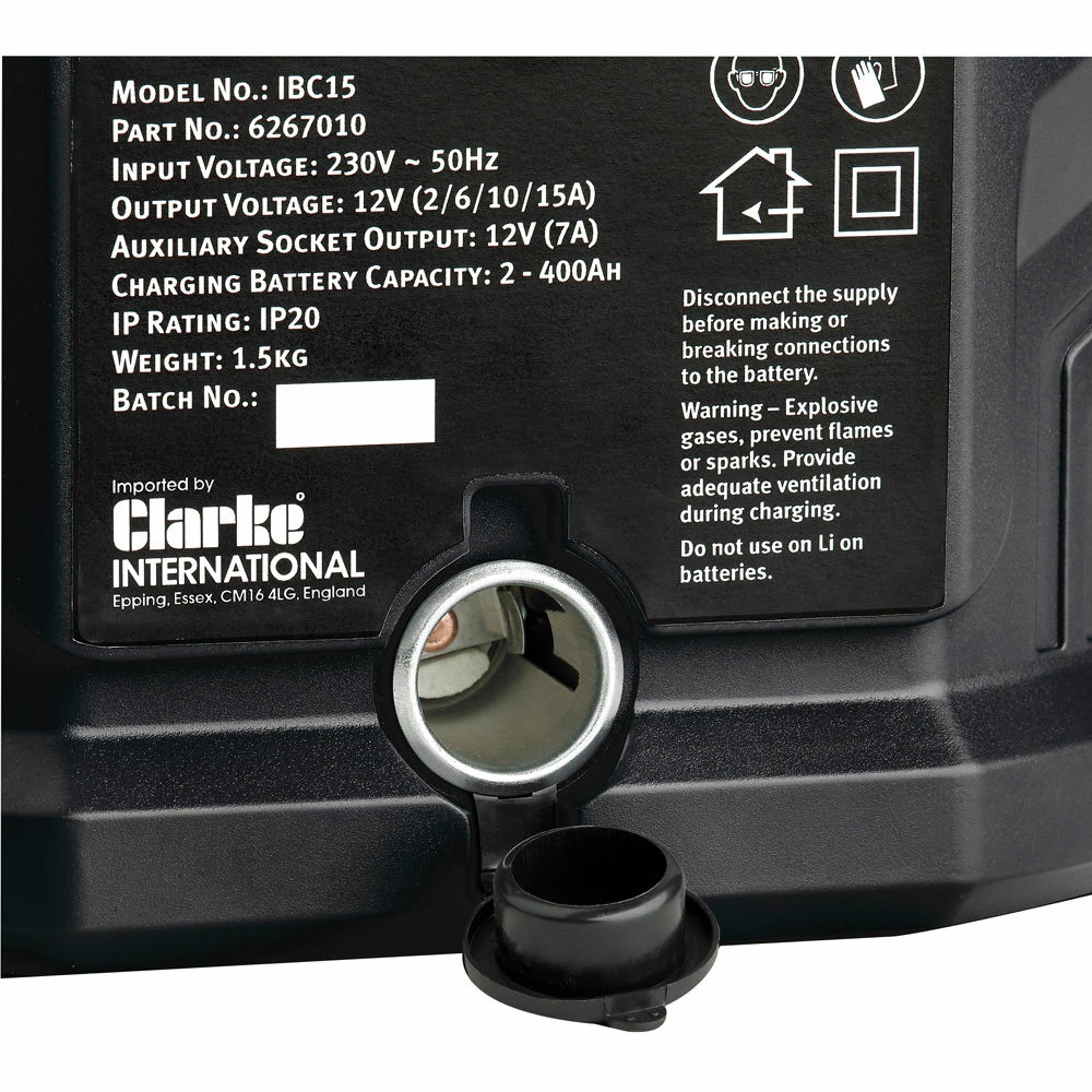 The Clarke IBC15 is suitable for use with all types of 12V lead acid batteries and can deliver up to 15A of charging. This unit benefits from a boost feature (12V 15A) for faster charging and the IBC15 also has a 12V socket for conveniently charging other devices.