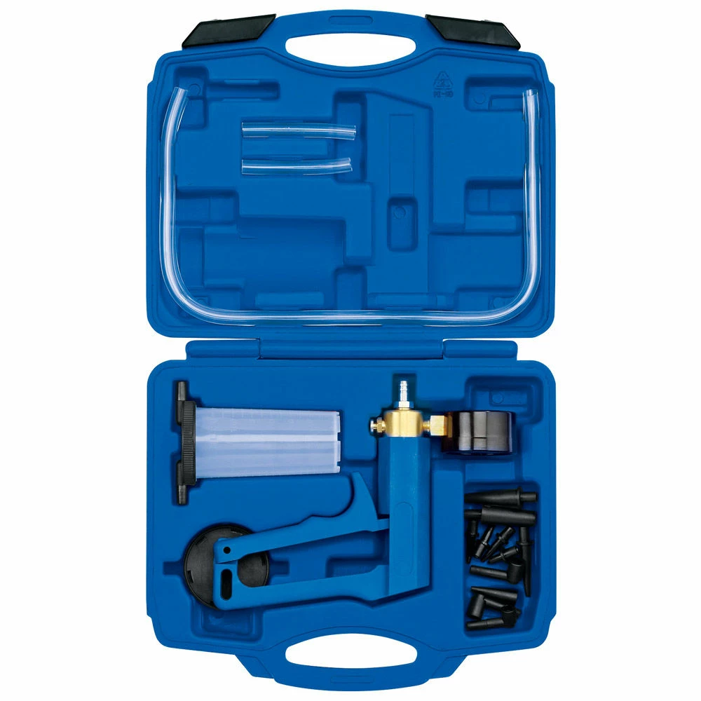 Compatible with most vehicles and includes a comprehensive kit for bleeding brake and clutch units. Also suitable for fault finding common issues including; air conditioning, fuel, transmission, turbo waste gates, valve stem oil seals, ignition and emissions. Dual reading pressure gauge 0-760mmHg/0-30inHg. Easily dismantled for cleaning. Supplied in a plastic storage case.
