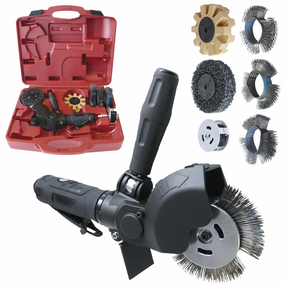 Easy to use, the air powered surface preparation tool allows fast and efficient work. Its different brush attachments allow it to be used in multiple surface stripping car bodywork applications. The low heat generated during use does not produce toxic smoke, sticky materials do not smear and there is no removal of healthy material.