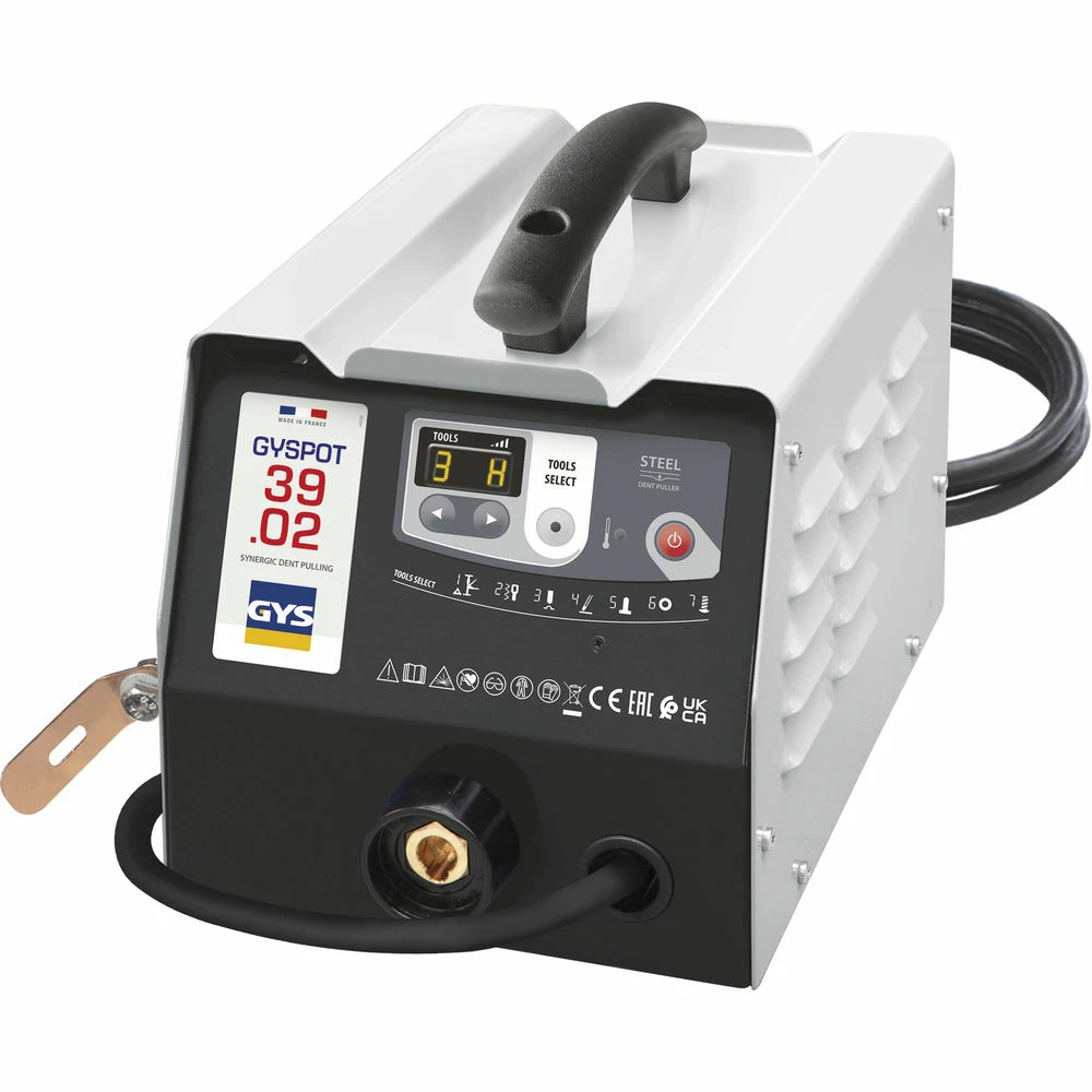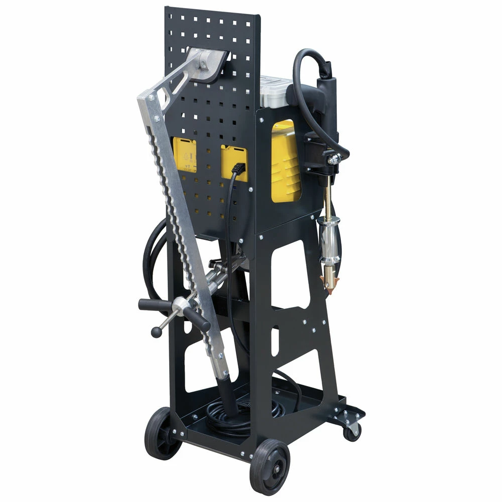 The kit contains dent pulling generator, trolley, double action levelling bar & dent pulling accessory/consumables box including slide hammer, pulling rings, pulling stars & wavy wire (for curved dents), panel shrinking electrode & more.