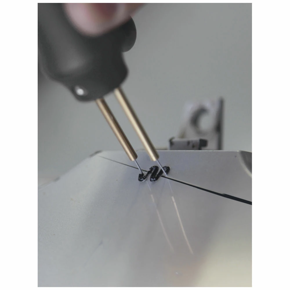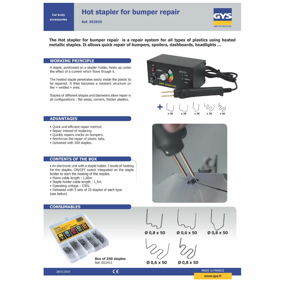 The hot stapler kit allows repairs to all types of plastic bumpers, spoilers, dashboards, headlight surrounds etc. The heated staple easily penetrates the plastic part being repaired to provide structural strength.