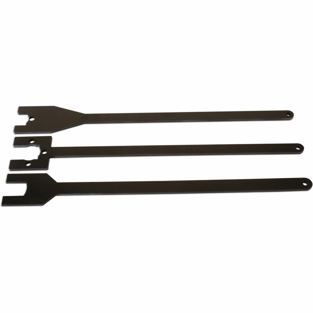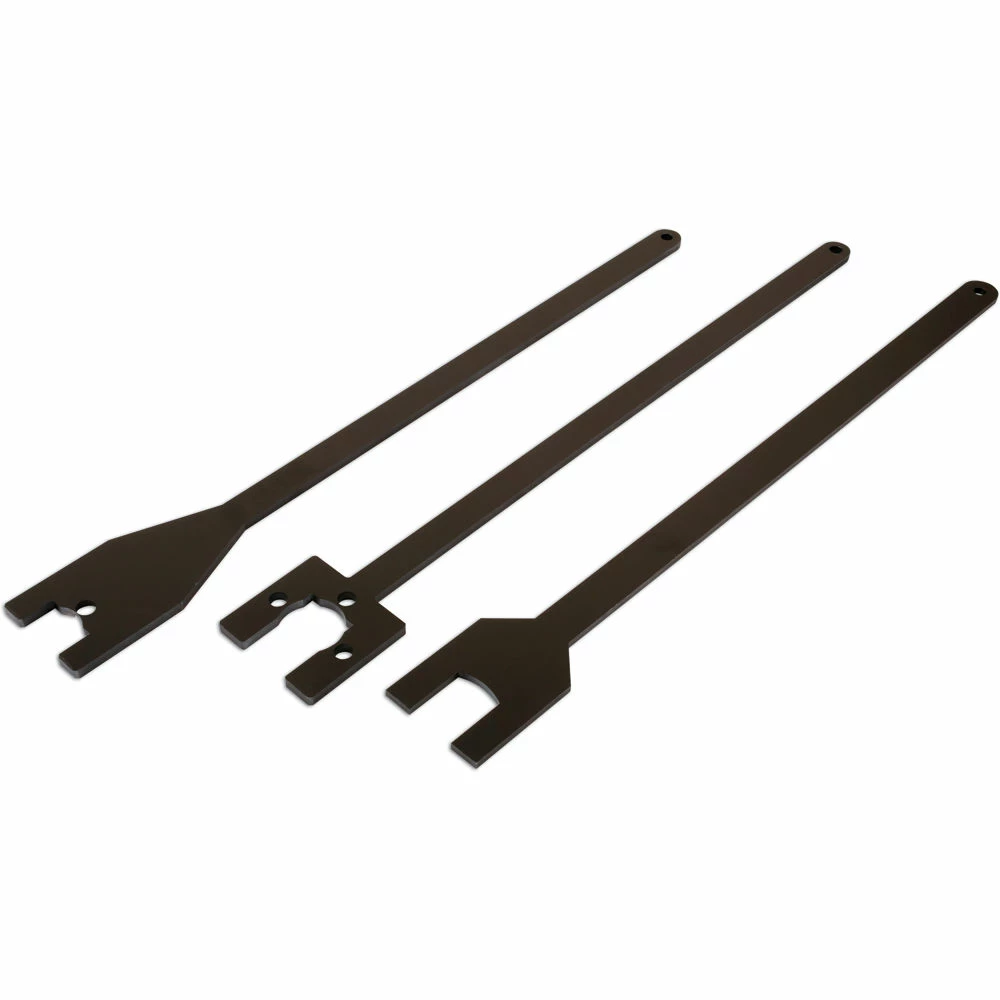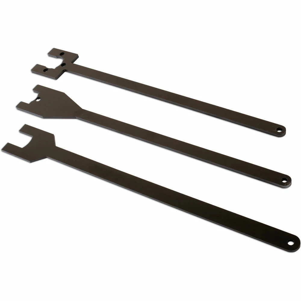 This 3 piece spanner set is designed to remove the viscous engine fan from the water pump, in order to gain access when replacing the water pump or coolant radiator or to replace the fan itself. These 3 tools are purpose-designed for the job and shuld be used in pairs, one to hold, and one to undo, depending on the specific Land Rover application. A point to remember when using these wrenches is that some of the applications are left hand threaded and some are right hand.