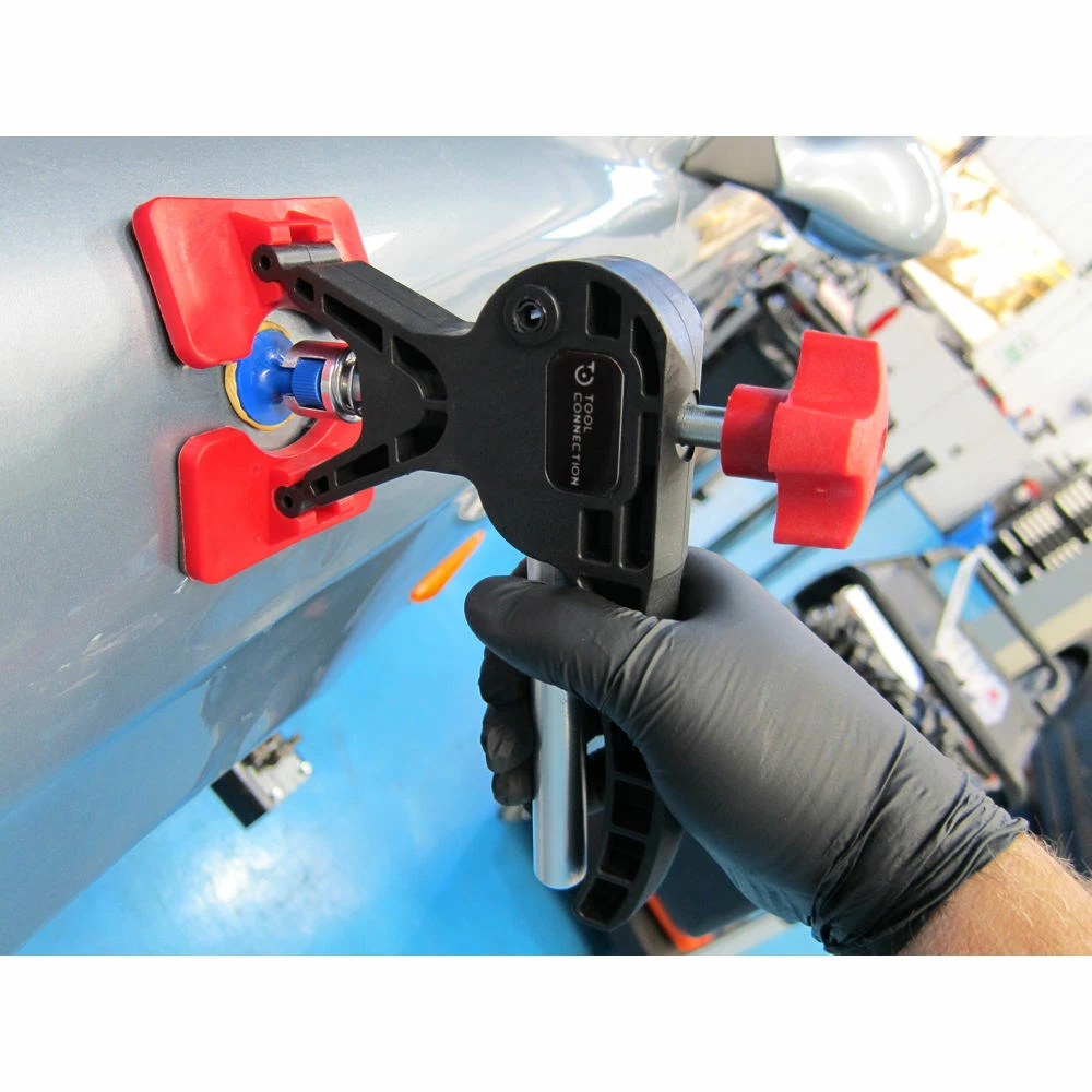 The glue pads are designed to grip the glue and pull in different ways. A split pad initially pulls strongly across the dent. Then the pad deforms as the metal moves out and the pad is pulling more from the centre. Small general dents can be removed swiftly with this process.
