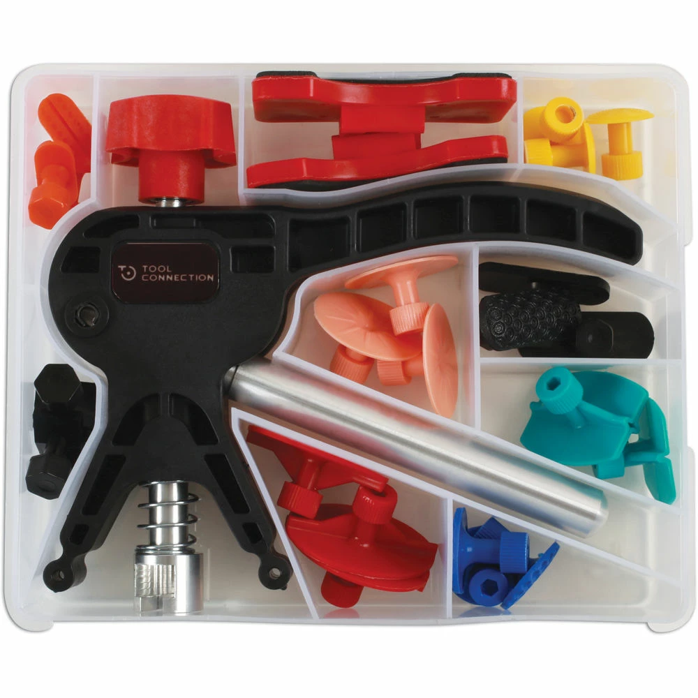 The Laser 7004 is a auto repair paintless dent puller tool set with 24 assorted pulling tabs suitable for use with a hot melt glue gun. This is a method of PDR (Paintless Dent Removal) and when used with care, the paintwork will not be damaged.