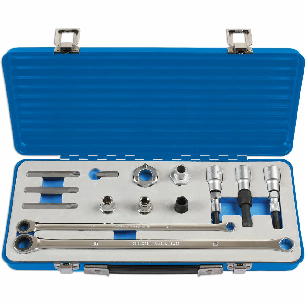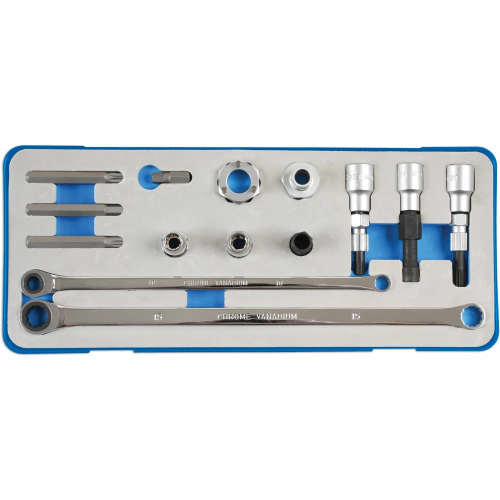 - 2 Double ended Ring Spanners: 15mm, 10mm plus 3 x 75mm long x 10mm Hex Drive Bits: M10 Spline, 8mm Hex and T50 Star Bits plus 1 x 30mm x 10mm Hex Drive x 8mm Hex