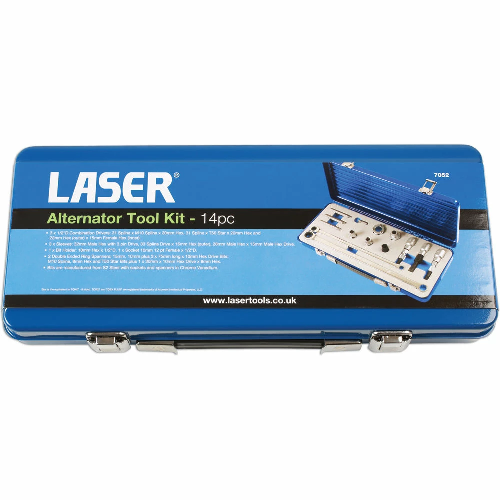 The 7052 is an alternator pulley holding and removal kit for Nipondenso, Valeo, Bosch and Marelli alternators. This set includes: