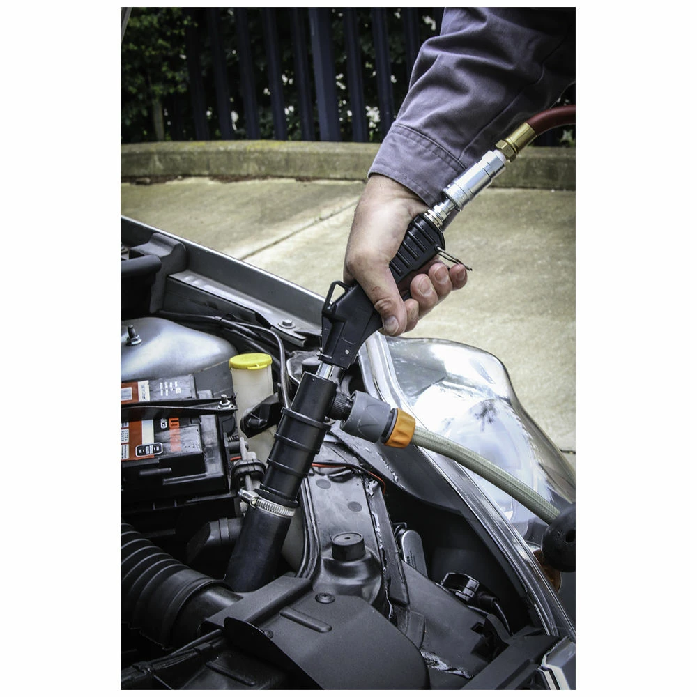 Enables thorough flushing of debris and contaminants from cooling system during repair and maintenance. Powered by workshop air, which creates a vacuum to draw water from a container. Can also be used with mains pressure tap water.